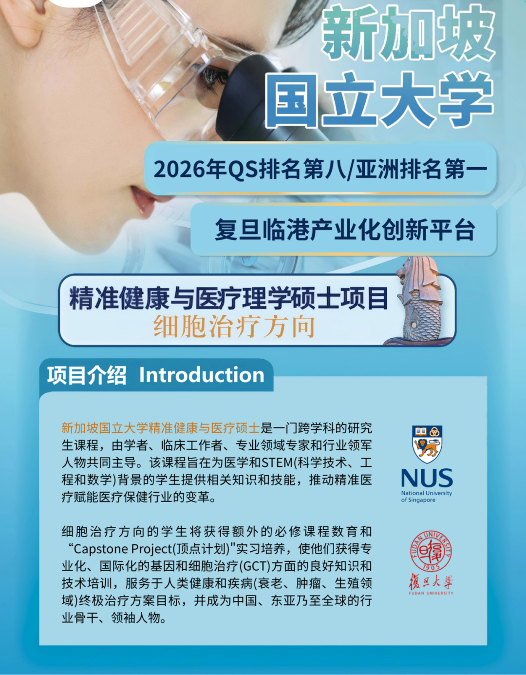 新加坡国立大学医学院于2024年11月与复旦大学临港产业化创新平台签订了合作备忘录,将在今后10年(2025-2035)招收细胞治疗方向的精准健康和医疗硕士3000名,平均每年300人。细胞治疗方向的学生将获得额外的必修课程教育和“Capstone Project(顶点计划)”实习培养,使他们获得专业化、国际化的基因和细胞治疗(GCT)方面的良好知识和技术培训,服务于人类健康和疾病(衰老、肿瘤、生殖领域)终极治疗方案目标,并成为中国、东亚乃至全球的行业骨干、领袖人物。