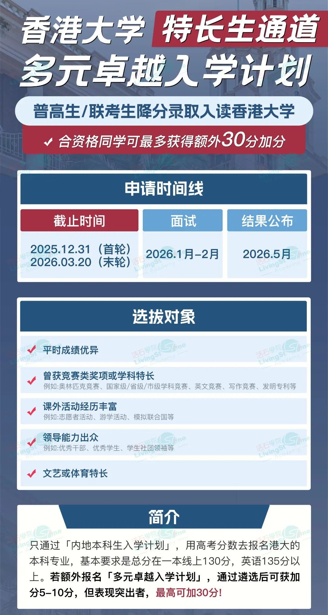@2026届高考生香港本科申请已经开放🔥高考生最高可加30分的港大多元卓越入学计划12月31日首轮申请截止仅剩2个月时间!抓紧时间递交申请~