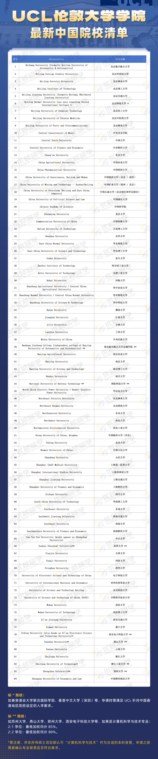 今年 UCL 的中国院校清单里有 84 所,整体上看起来,和25FALL区别不大,但有一些专业的均分要求和通用要求不一致。