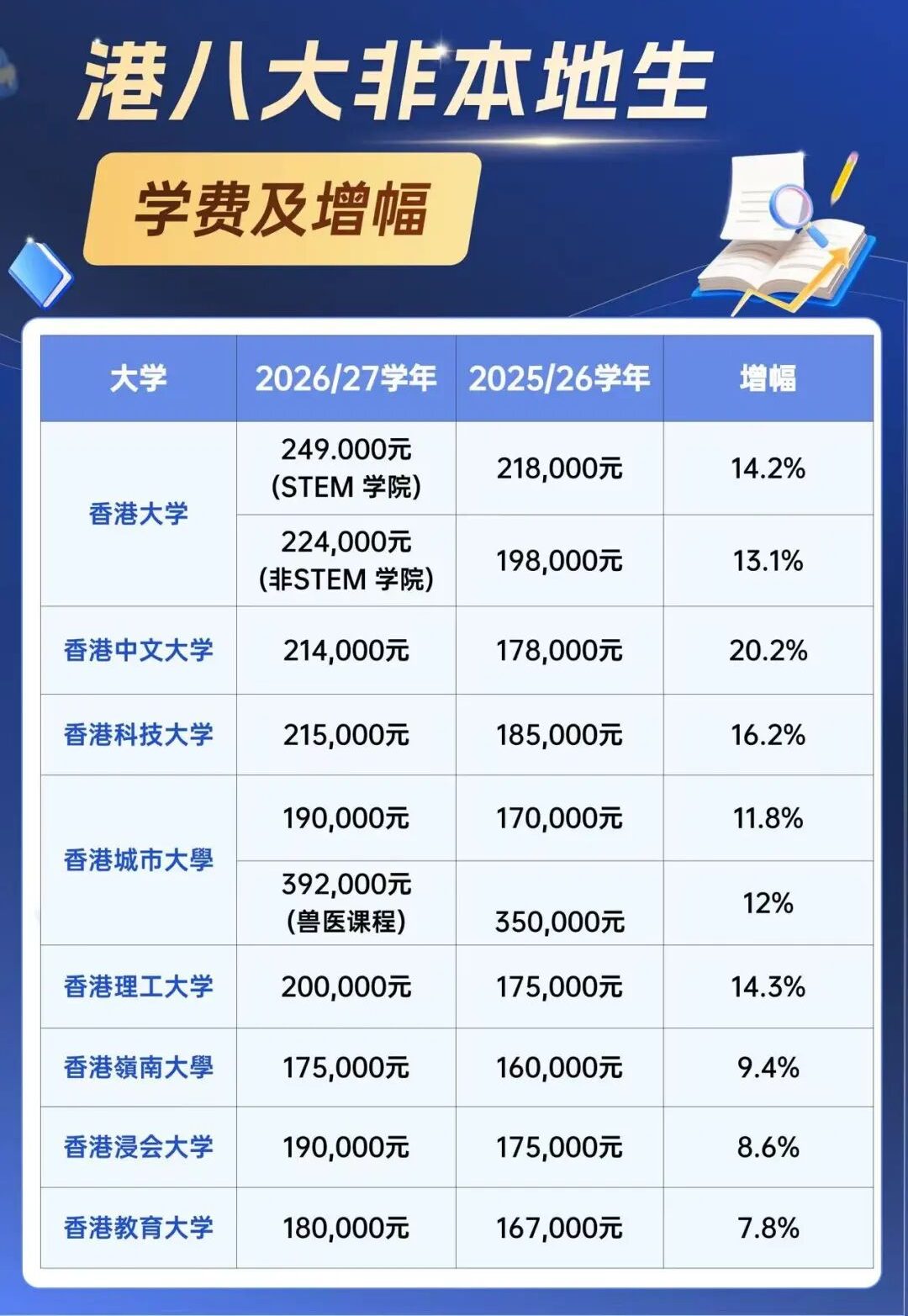 近日,香港多间大学相继发布2026/27学年招生信息,八大下学年将再次全线调升非本地生学费。
