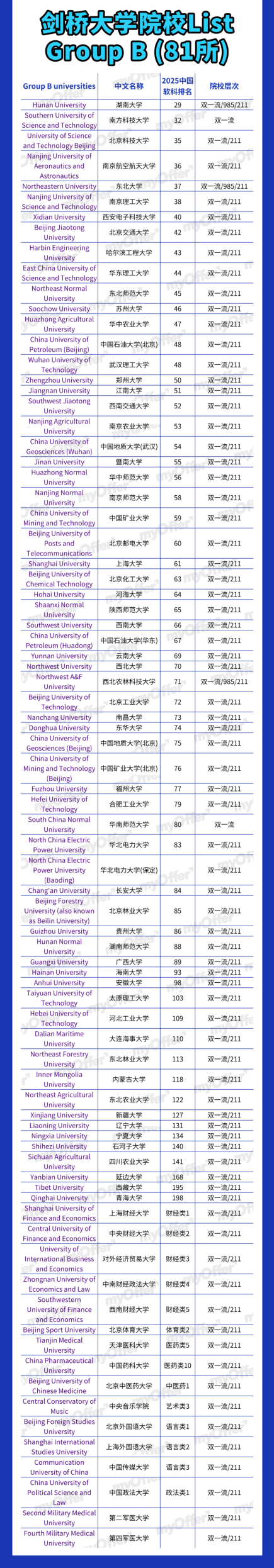 剑桥大学今年一大变化是首次公开了中国大学名单,将中国大陆院校清晰划分为A、B两组及其他认可院校,为申请学生提供了更为明确的参考依据。