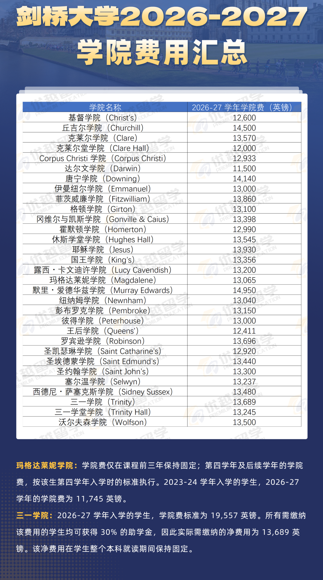 再来说学院费,剑桥学院费是学院自己定的,2026-2027年国际生一年大概1.15万 - 1.495万英镑。具体可以看看下面这些常见学院的情况: