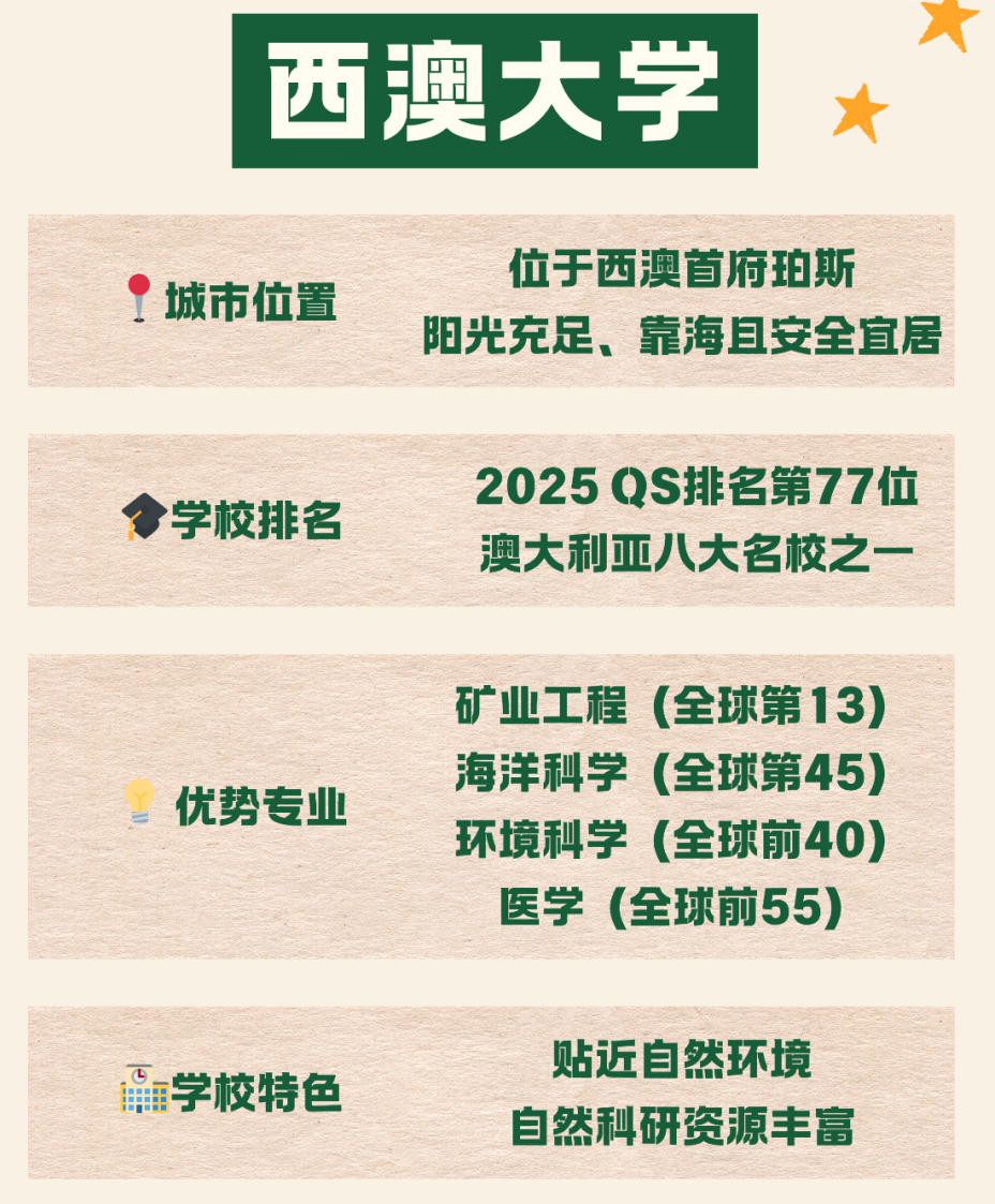 UWA以强大的科研资源著称,尤其在海洋科学、资源工程、医学与农业领域表现突出。学校与业界紧密合作,毕业生就业率在澳大利亚名列前茅。对于希望在自然资源、环境、科技领域深造的学生而言,UWA提供了极具实践性的路径。