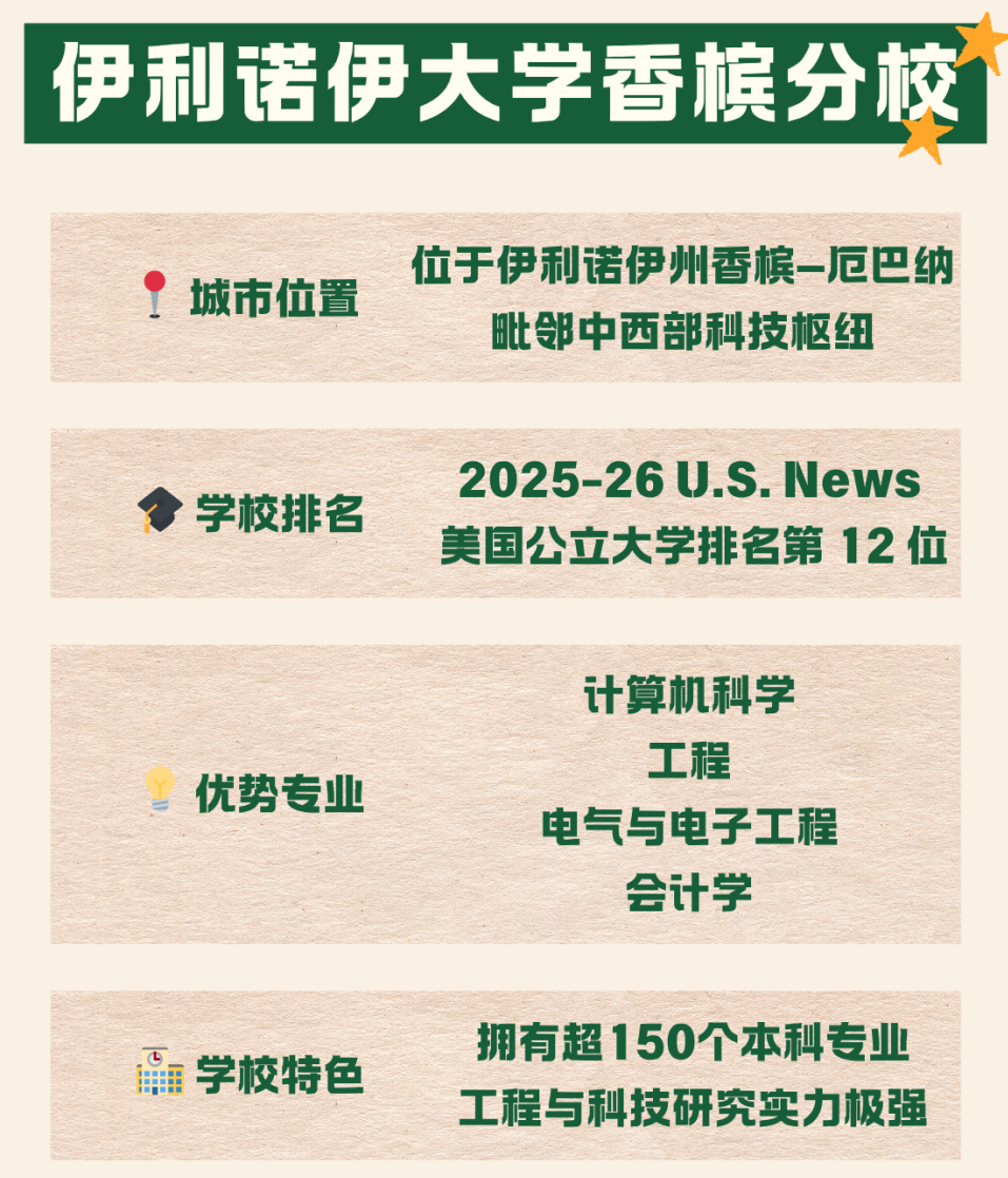 伊利诺伊大学香槟分校(University of Illinois Urbana-Champaign,简称UIUC)创立于1867年,是美国最早一批设立的公立大学之一。学校位于伊利诺伊州香槟—厄巴纳双城,地处芝加哥与圣路易斯之间的交通枢纽地带,学术氛围浓厚。