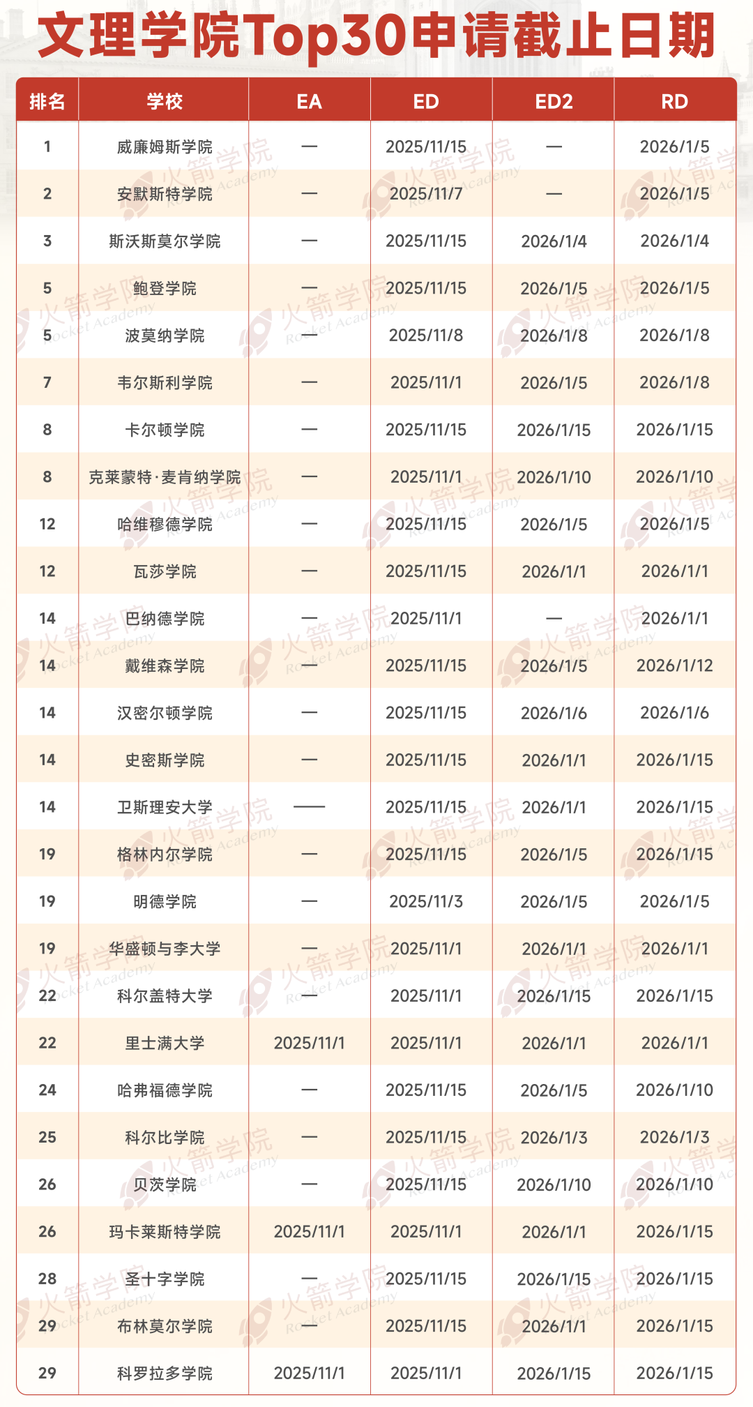 文理学院方面,机会则更为丰富。在Top 30的文理学院中,除了威廉姆斯学院、阿默斯特学院等极少数,其余27所均开放ED2申请,截止日期从1月1日到1月15日不等,给了申请者更大的灵活性。