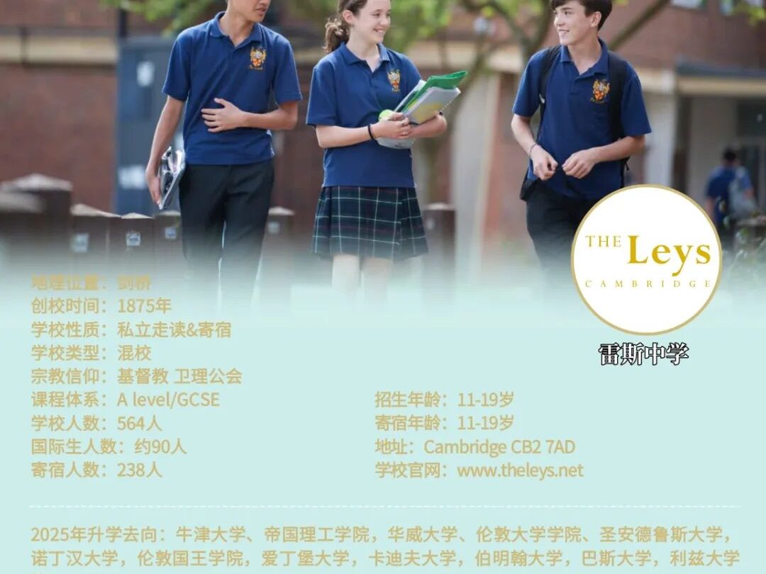 The Leys是剑桥唯一的男女同校寄宿和日托学校,学校创建于1875年,招收11至18岁的男女学生。学校对面便是剑桥大学工程学部,学术气氛浓厚。距离广场、剑桥大学的各学院、费兹威廉博物馆、剧院和音乐厅都非常近。
