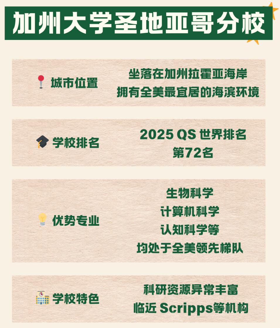 相比 UCLA、Berkeley 的“全场景大竞技”,UCSD 更像理性而稳定的科研基地——安静、专业、效率至上。学生可以同时拥有接近硅谷的机会、加州最好的海岸线、以及美国顶尖的STEM资源。对于规划清晰、偏向科研与技术路线的同学来说,它是一所非常“稳”的选择。