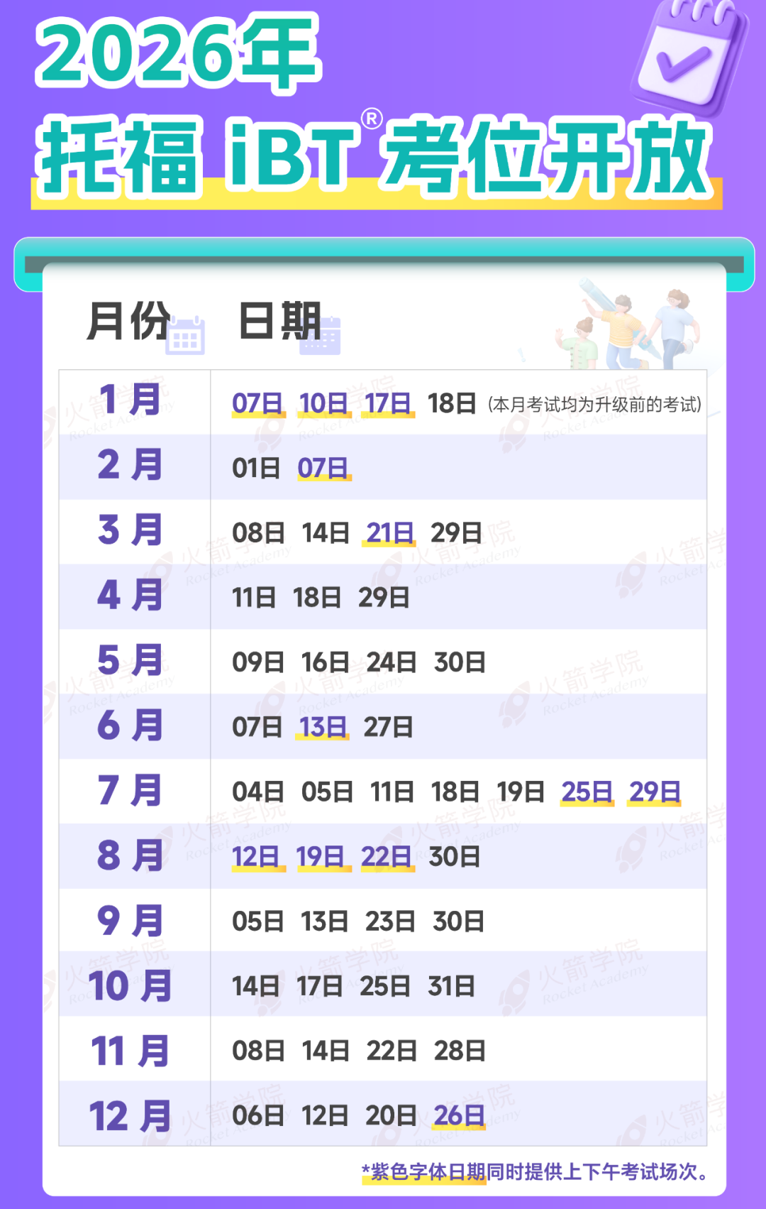 2026年ETS共安排47个考试日的59场托福考试,相比2025年的41个考试日期和67场考试来说,2026年考试场次有所减少。