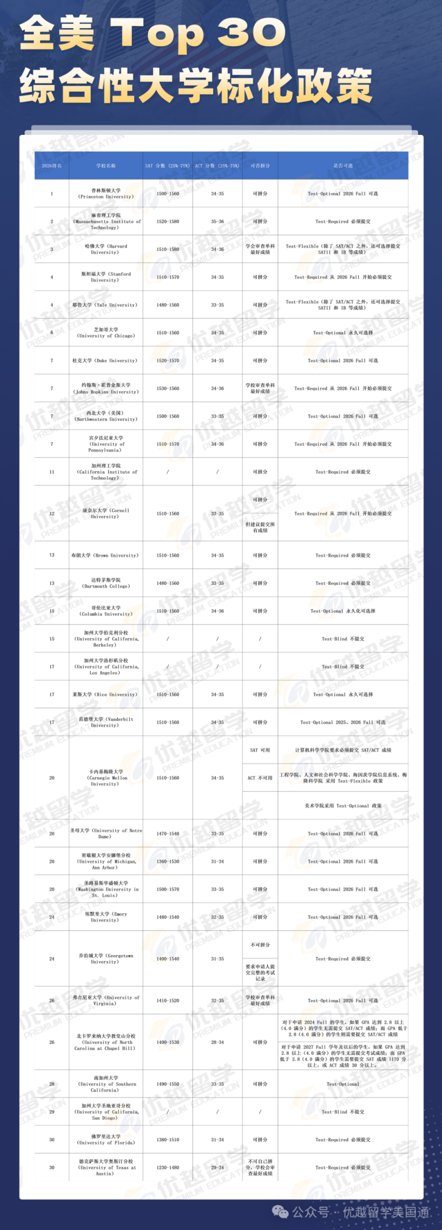 麻省理工学院、斯坦福大学、约翰霍普金斯大学、宾夕法尼亚大学、加州理工大学、康奈尔大学、达特茅斯学院、卡耐基梅隆大学(CS学院)、乔治城大学、北卡罗来纳大学教堂山分校(GPA 2.8以上免标化)、佛罗里达大学、德州奥斯汀大学,(普林斯顿大学从2028 Fall开始恢复标化强制要求,2026 Fall和2027 Fall仍采用可选政策)