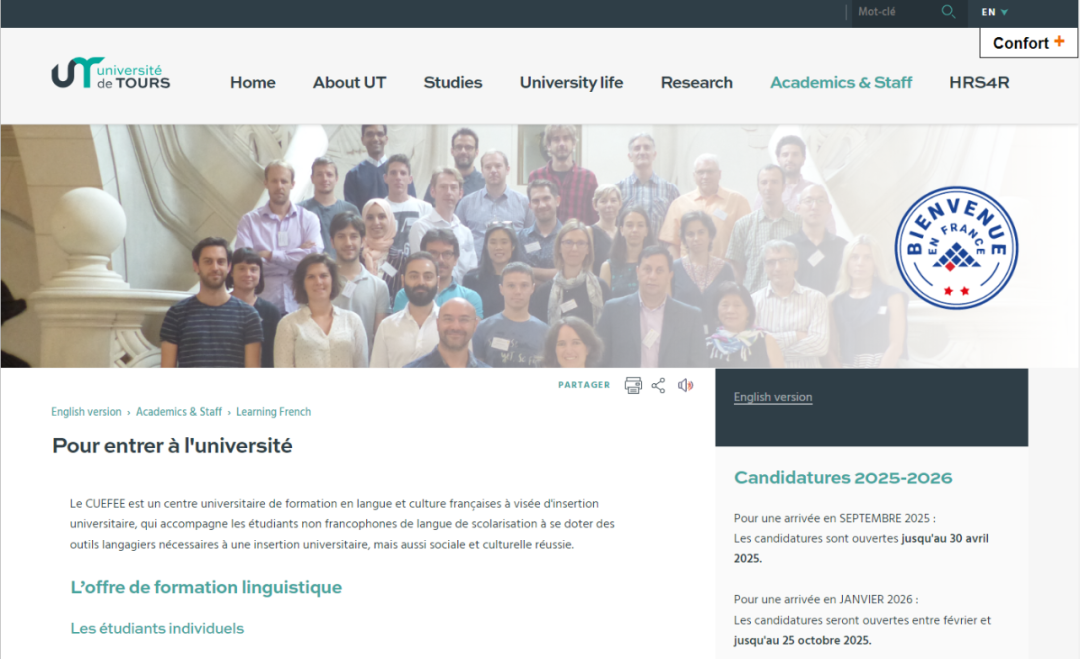 该课程面向合作大学的交换生,在名额允许的情况下,也向所有非法语母语的UPJV学生开放。