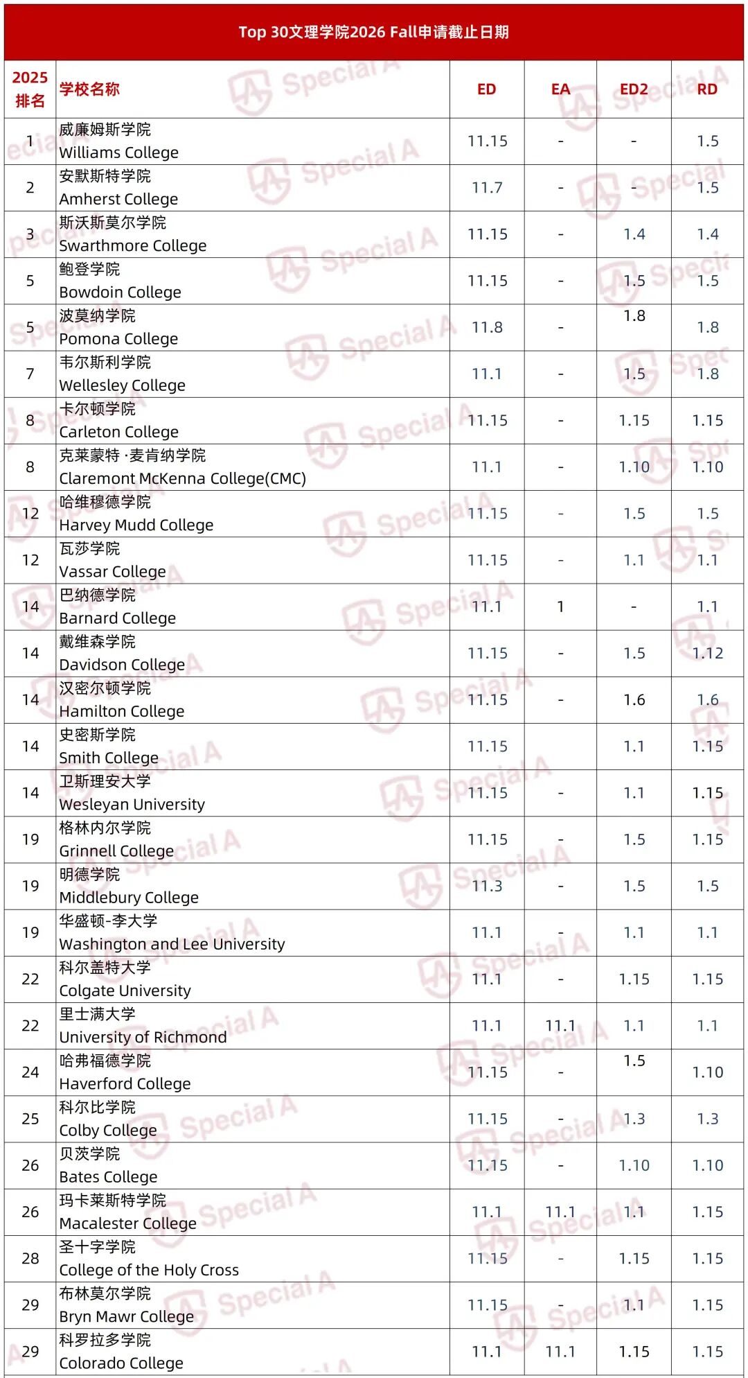 针对新的申请轮次和政策,特老师也为大家整理汇总了TOP 50综合性大学、TOP 30文理学院的2026 Fall申请截止日期,可收藏方便查看!