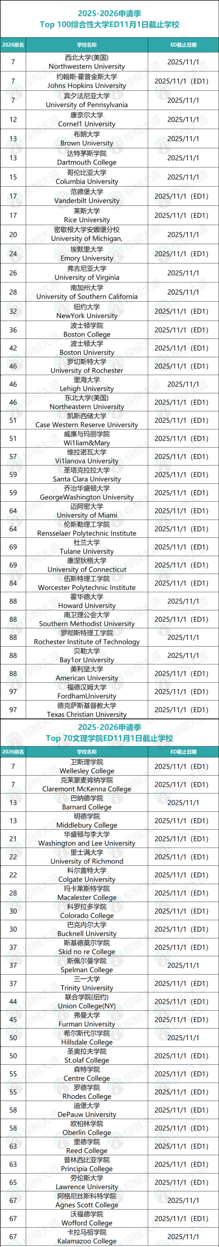 今天盘点「2025年11月1日申请截止的Top 100大U和Top 70文理校」,希望同学们能在最后冲刺阶段合理安排时间,如愿敲开梦校大门!
