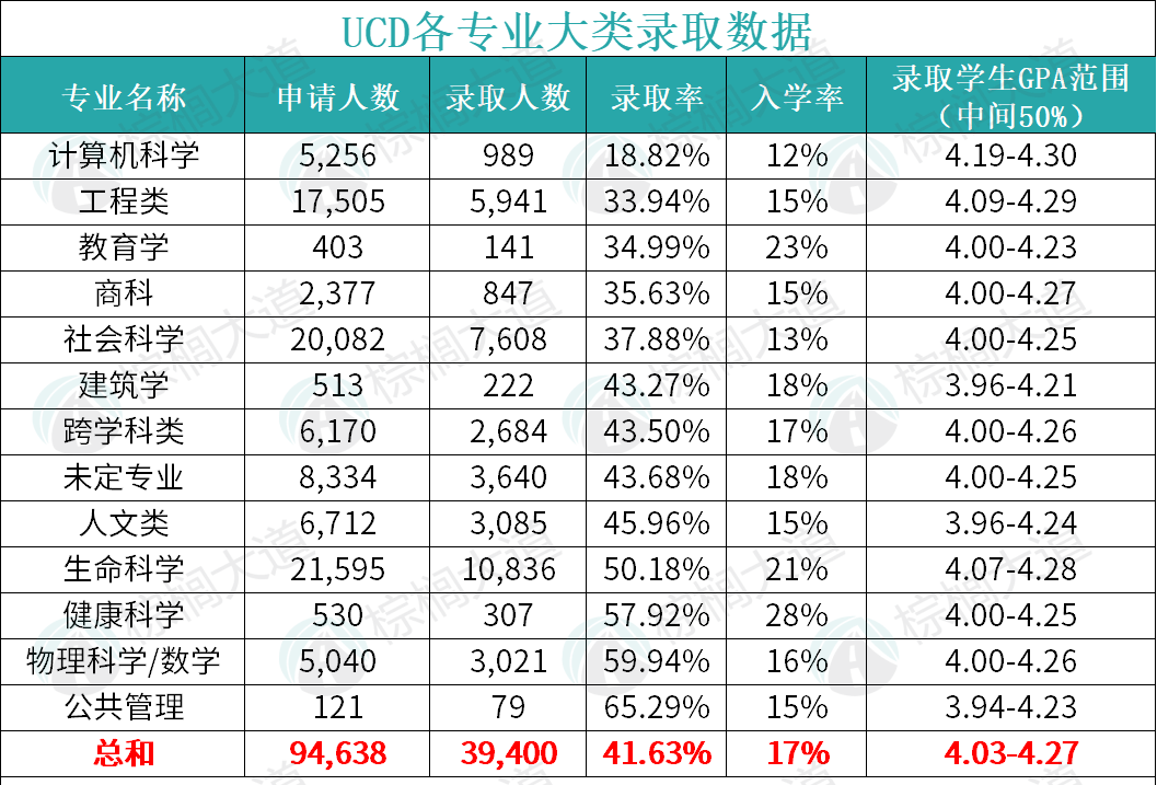 UCD:2025 Fall总录取率44.64%,国际生录取率57.15%,州外学生录取率63.44%,州内学生录取率37.26%。最难申的专业是计算机、设计、商科、心理学、建筑;农业与环境科学学院、文理学院录取率最高,分别为53%、50.7%。