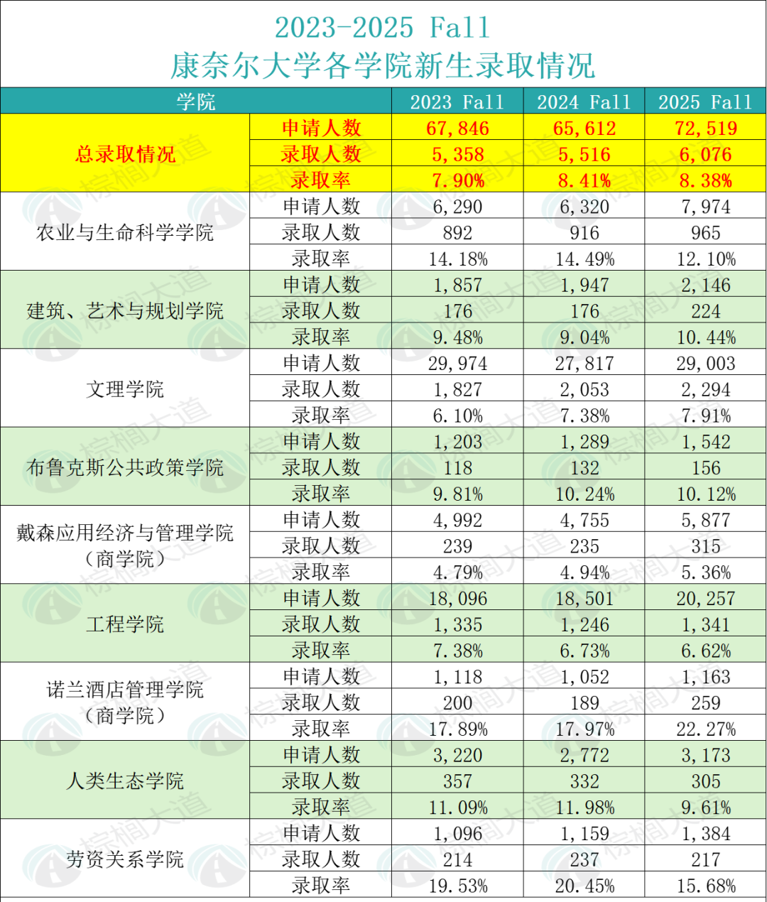 康奈尔大学近日新公布了2025 Fall录取数据,分享给大家一个好消息,这所“录取最友好的藤校”扩招了560名新生,录取趋势很稳!先看总体录取情况:2025 Fall一共收到72,519份申请,录取了6,076名新生(去年是5,516名新生),总录取率8.38%与去年持平。入学人数也迎来上涨,达到3861人,入学率为63.54%。