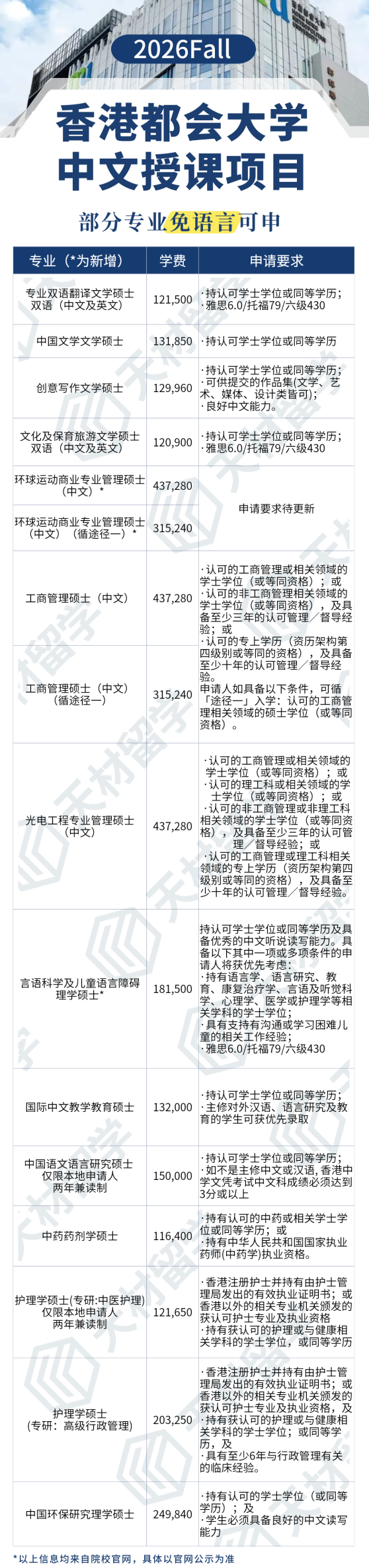 香港都会大学即将在11月12日开放26Fall的入学申请啦!本次新增了5个硕士项目,含中文授课。