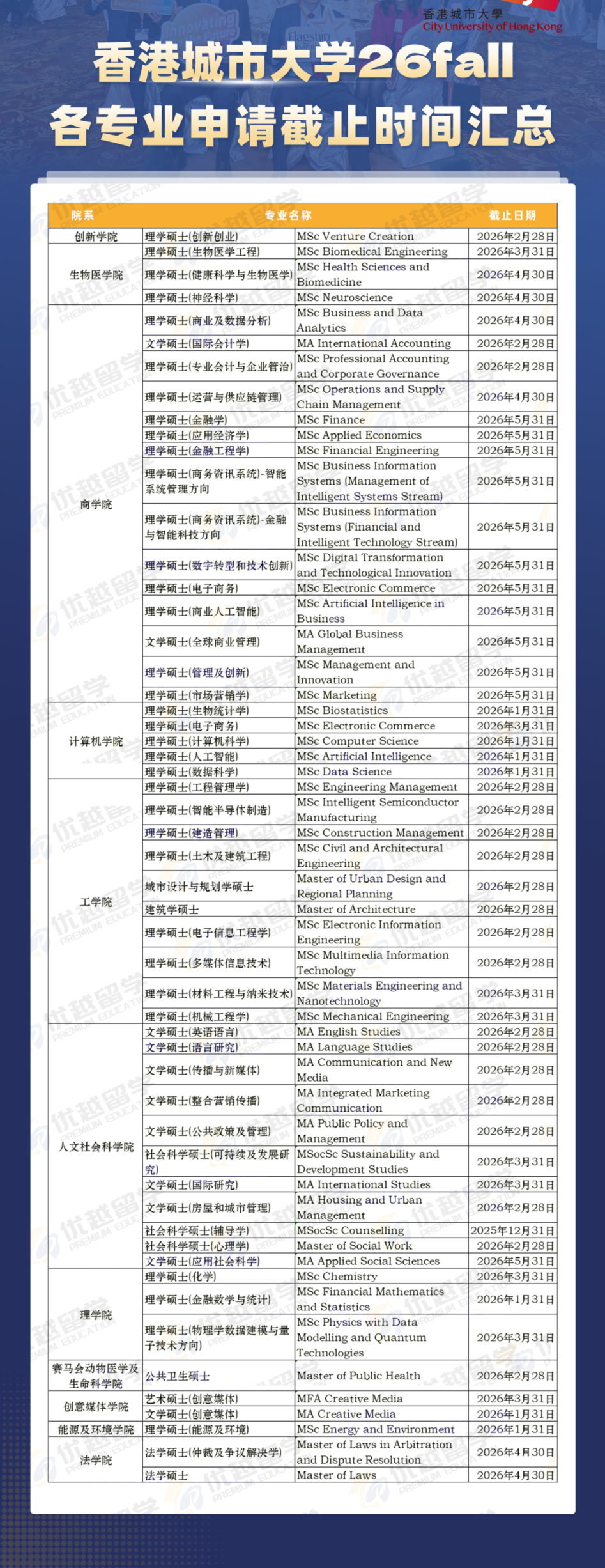 香港城市大学计算机、理学院等理工科专业多在 2026 年 1-3 月集中截止;商学院热门专业(金融、会计等)至 2026 年 5 月;人文社科学院多数专业截止集中。