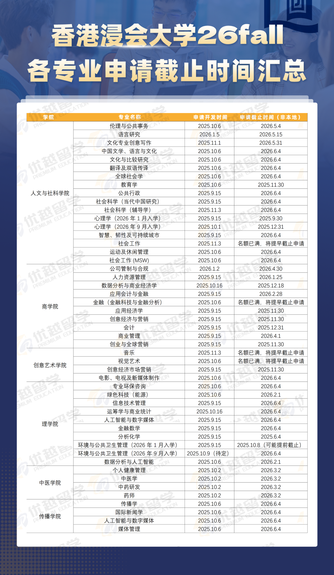 香港浸会大学 2026fall专业差异大、部分热门专业由于名额满已经提前截止、时间跨度较广的特点。商学院、创意艺术学院的热门专业(如金融、音乐、视觉艺术)截止早或因名额满提前截止,需尽早筹备;人文与社科、理学院、传播学院多数专业截止集中在 2026 年 6 月,可灵活规划但要留意部分专业的节点差异。