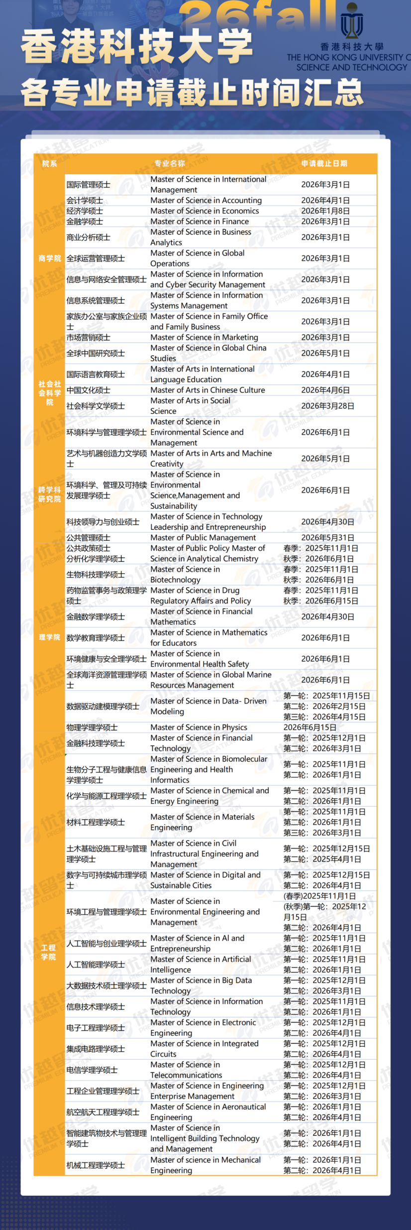 香港科技大学 2026fall 申请呈现工科理科多轮竞争、商科集中截止、跨学科与社科时间灵活的特点。