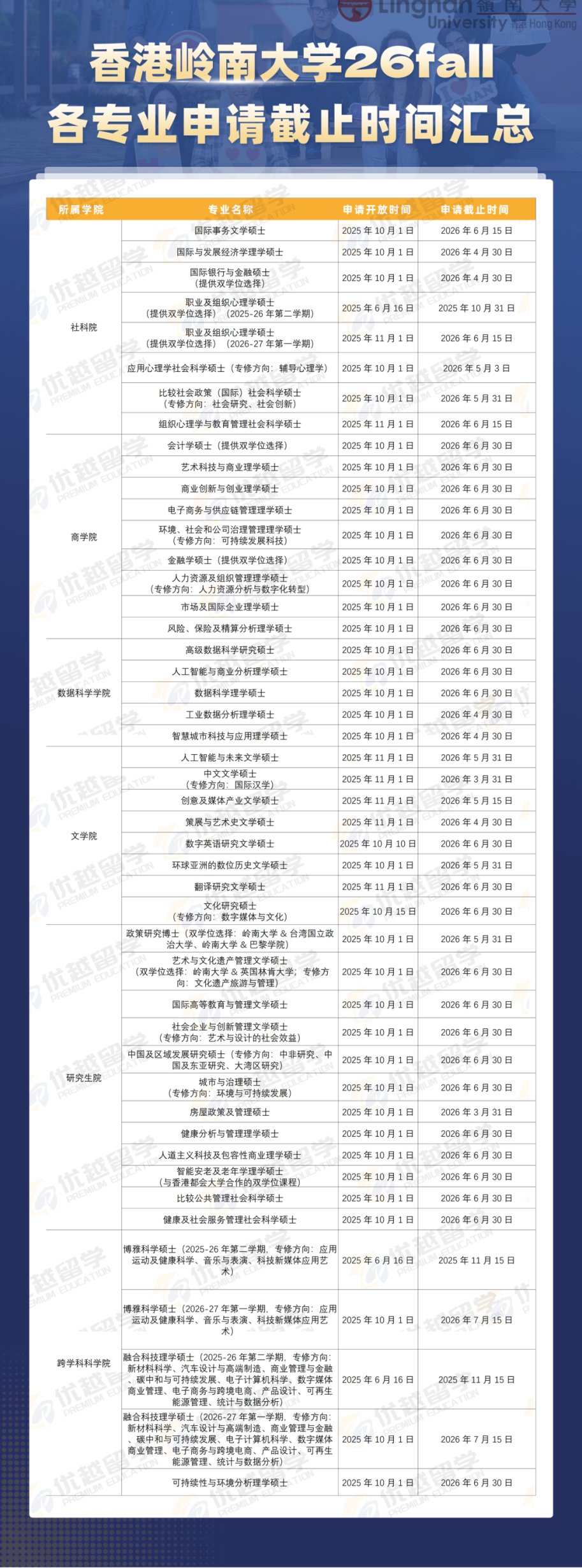 香港岭南大学 2026fall 申请呈现时间跨度较大、部分学院截止集中、文科专业节点分散的特点。商学院、数据科学学院多数专业截止集中在 2026 年 6 月,可集中规划材料;跨学科科学院和社科院部分专业截止较早,需提前筹备