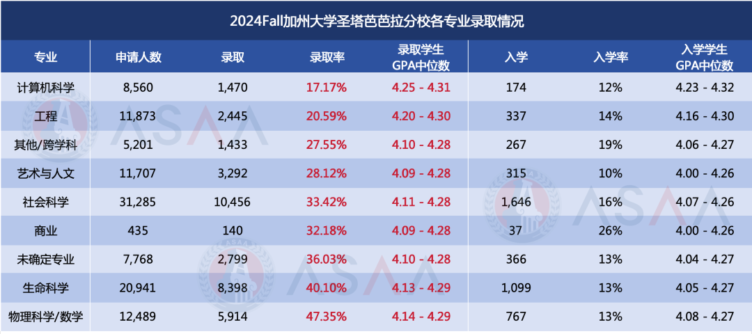 那么除了CS以外,UCSB其他专业的录取也是比较友好的,录取率基本都在20%以上。生命科学、商科、社会学科、物理科学/数学方向以及不定专业录取率有30%以上。