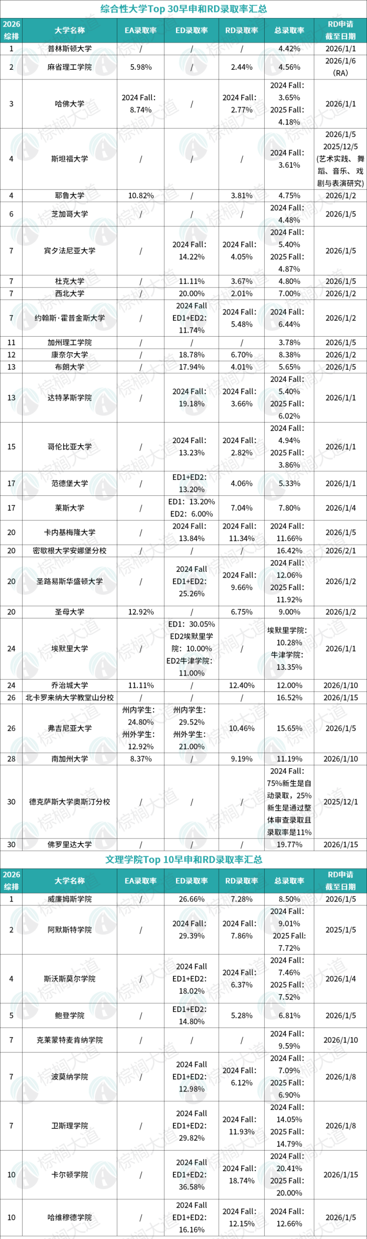 为此,老师统计了Top 30综合性大学和Top 10文理学院的2025 Fall及2024 Fall录取数据,并分享2个提升RD录取概率的必做事项!