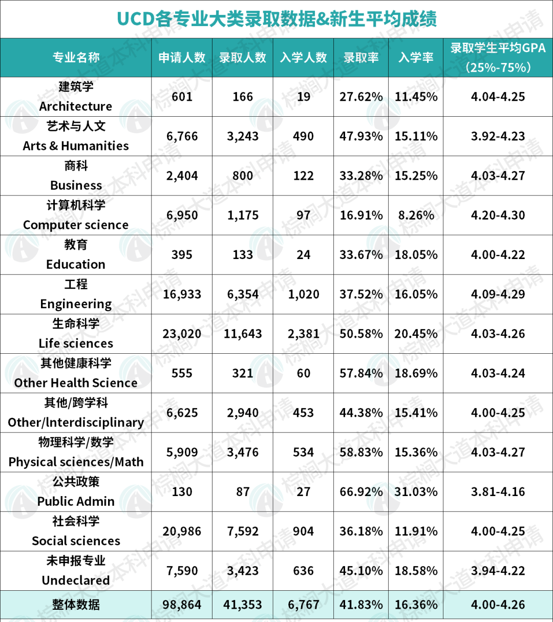 3,UCD录取新生成绩相对友好,平均GPA 4.00-4.26,公共政策、艺术与人文和未申报专业均录取了GPA 3.9-3.9的学生。