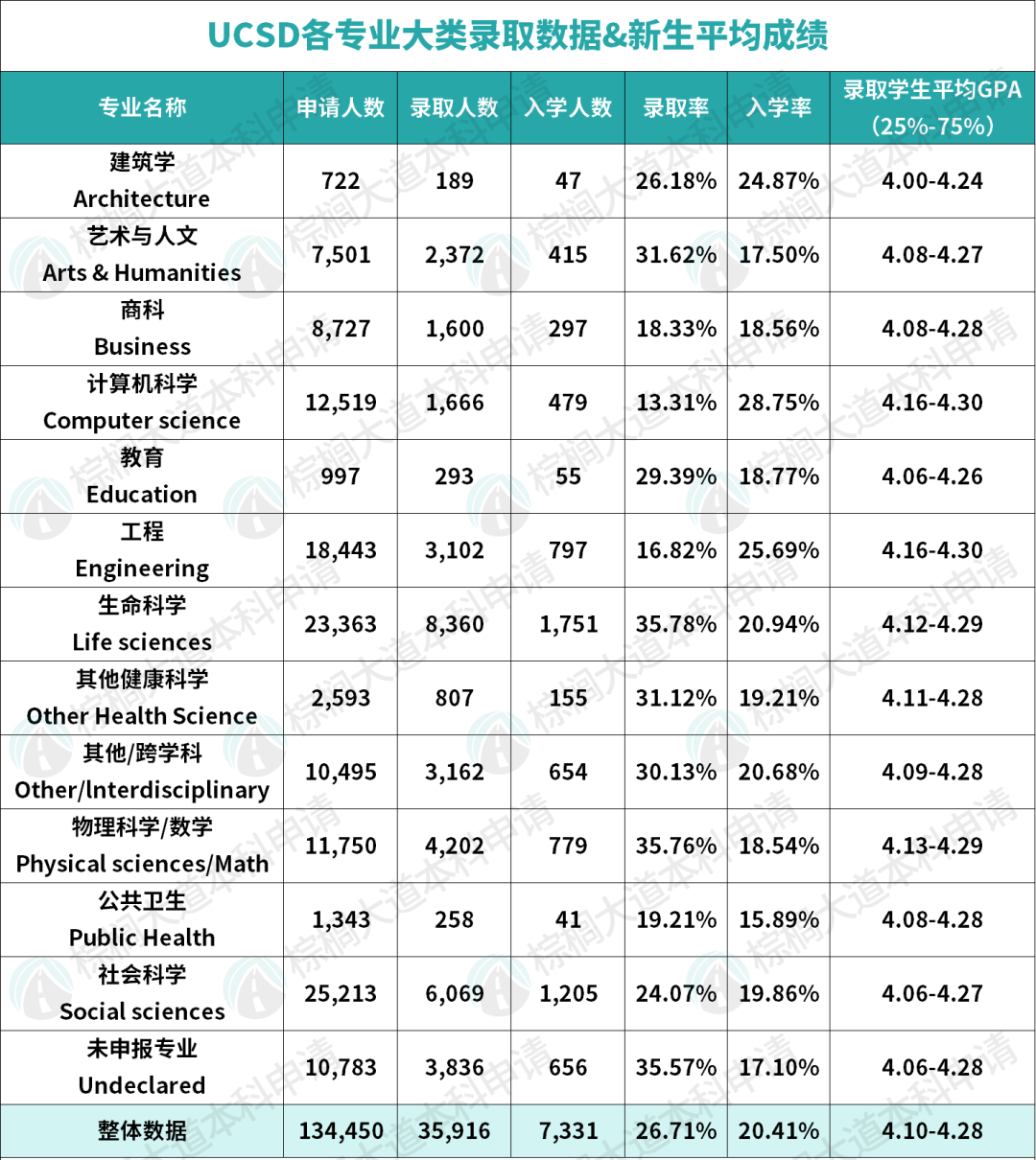 2,录取相对更友好、录取率均超30%的专业方向有:生命科学(35.78%)、物理科学/数学(35.76%)、艺术与人文(31.62%)。此外,UCSD对未申报专业和跨学科专业的学生都很友好,录取率也超30%。