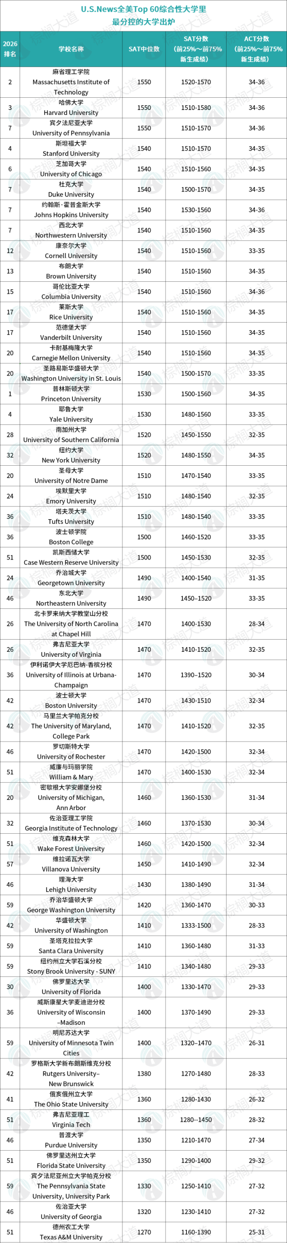 对于想了解美本名校的SAT/ACT录取分数线,并据此提高个人成绩的申请人,有极高的参考价值!话不多说,我们一起了解榜单详情!