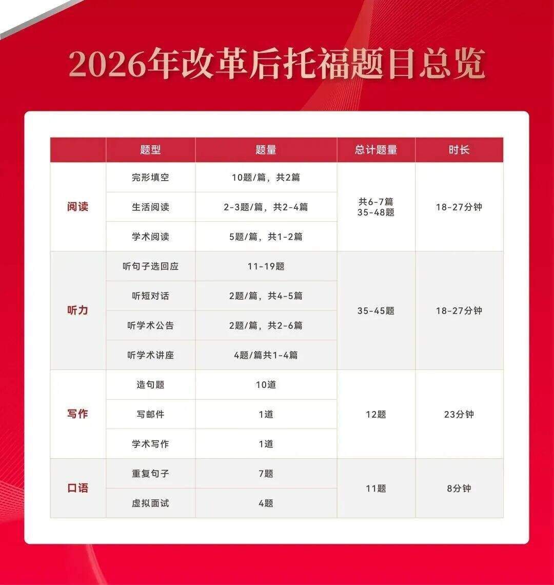 此次改革的核心调整集中于阅读、听力的 “题量 - 时长 - 难度机制”,以及写作、口语的题型创新,各模块新旧对比及核心变化如下,彻底厘清此前的信息歧义: