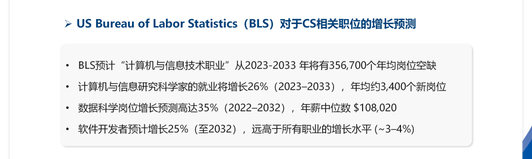 虽然可能很多学生和家长对计算机的就业感到迷茫,但是美国劳工部发布的关于计算机岗位的增长预测依然是相对乐观的,未来的就业市场仍旧需要相关人才。预测显示,未来十年间,计算机的相关岗位仍会有巨大的空缺,市场对人才的需求量是巨大的。