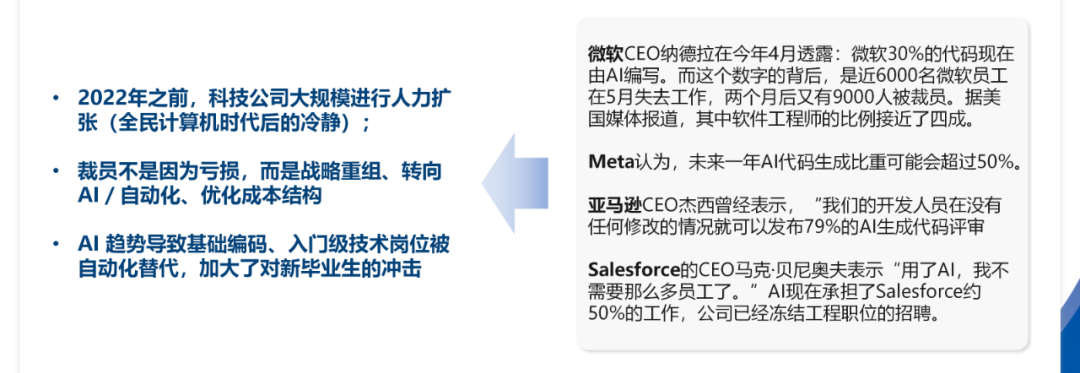 3、不可否认的是,AI的高速发展和广泛应用确实取代了一部分基础编码、入门级的科技岗位。那么对于这一方向的应届毕业生来说,产业的转型对他们带来的就业影响和压力是实际存在的。科技巨头的CEO也纷纷表示曾经需要人工编写的代码现在大量地被AI完成,并且被替代的比例可能会越来越高。
