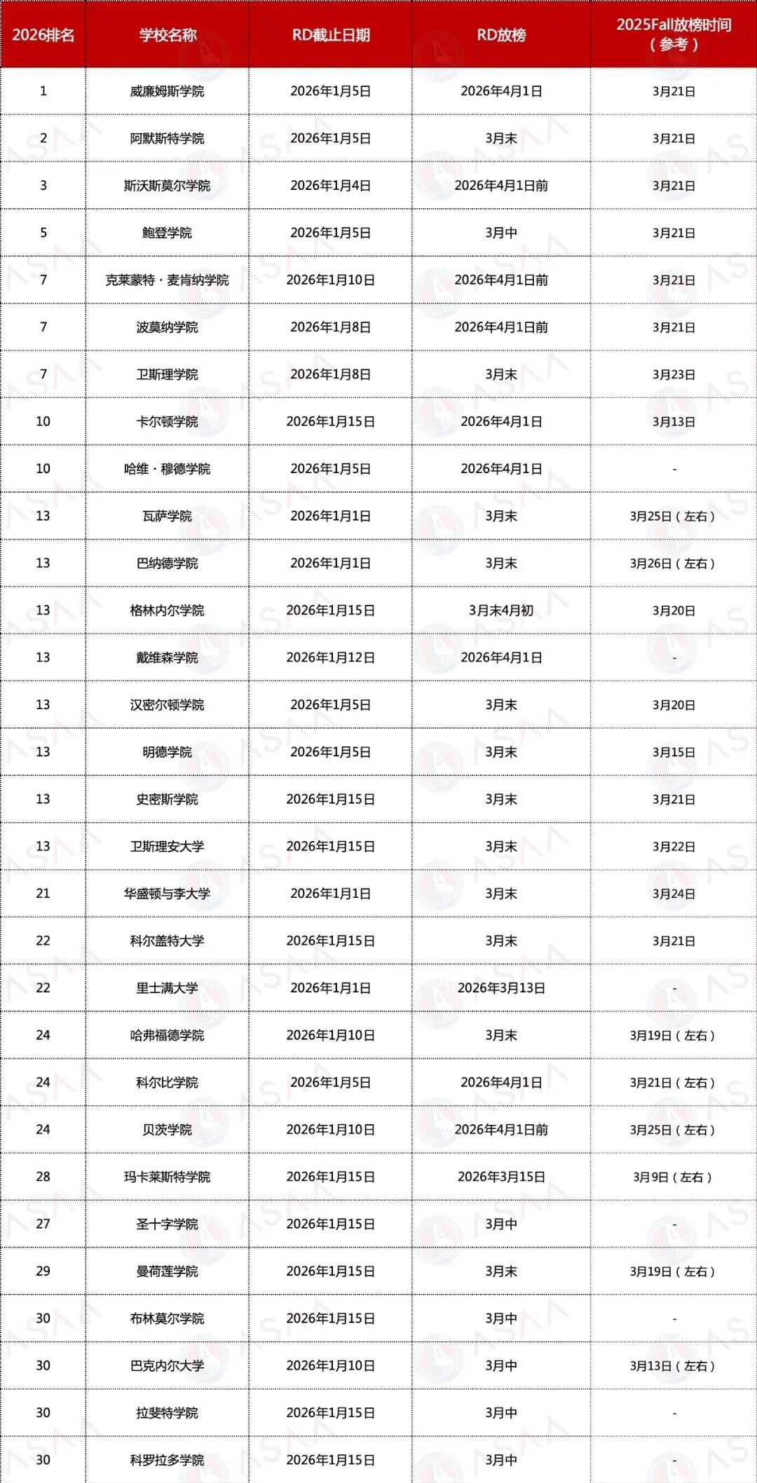 全美前30文理学院RD截止及放榜日期