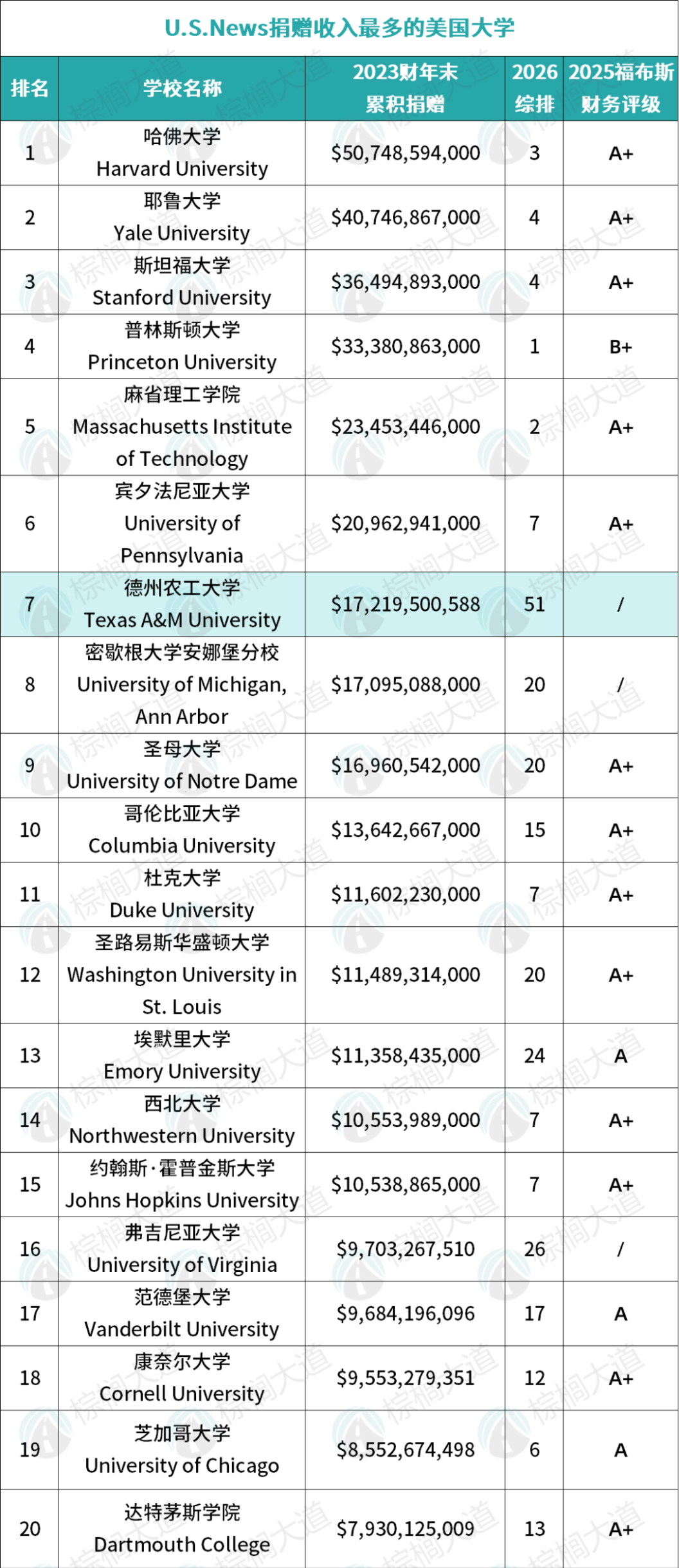 除《福布斯》评级外,U.S. News发布的“捐赠基金最多的美国大学”同样值得综合参考。