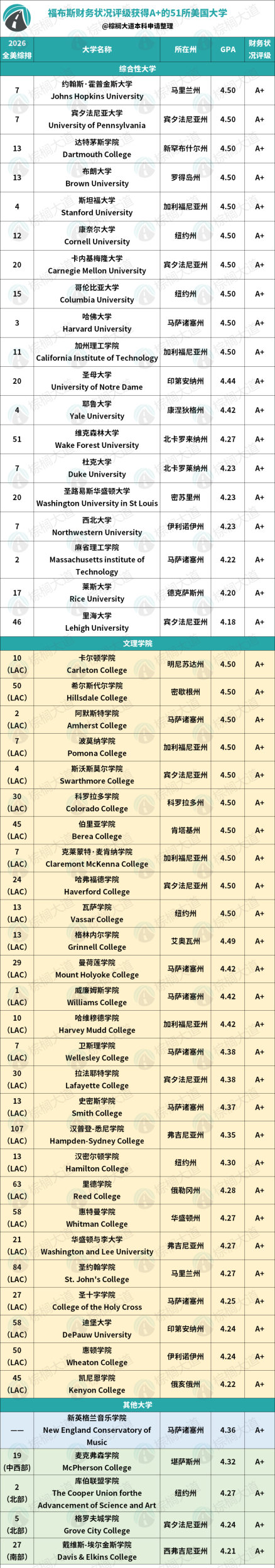 该评级中,共有51所美国大学获得A+,这些学校资金相对充足,财务状况稳健。