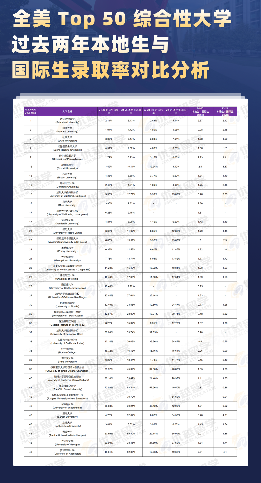 可以看到,在TOP50综合大学中,超过95%的学校本地生录取率都明显高于国际生。
