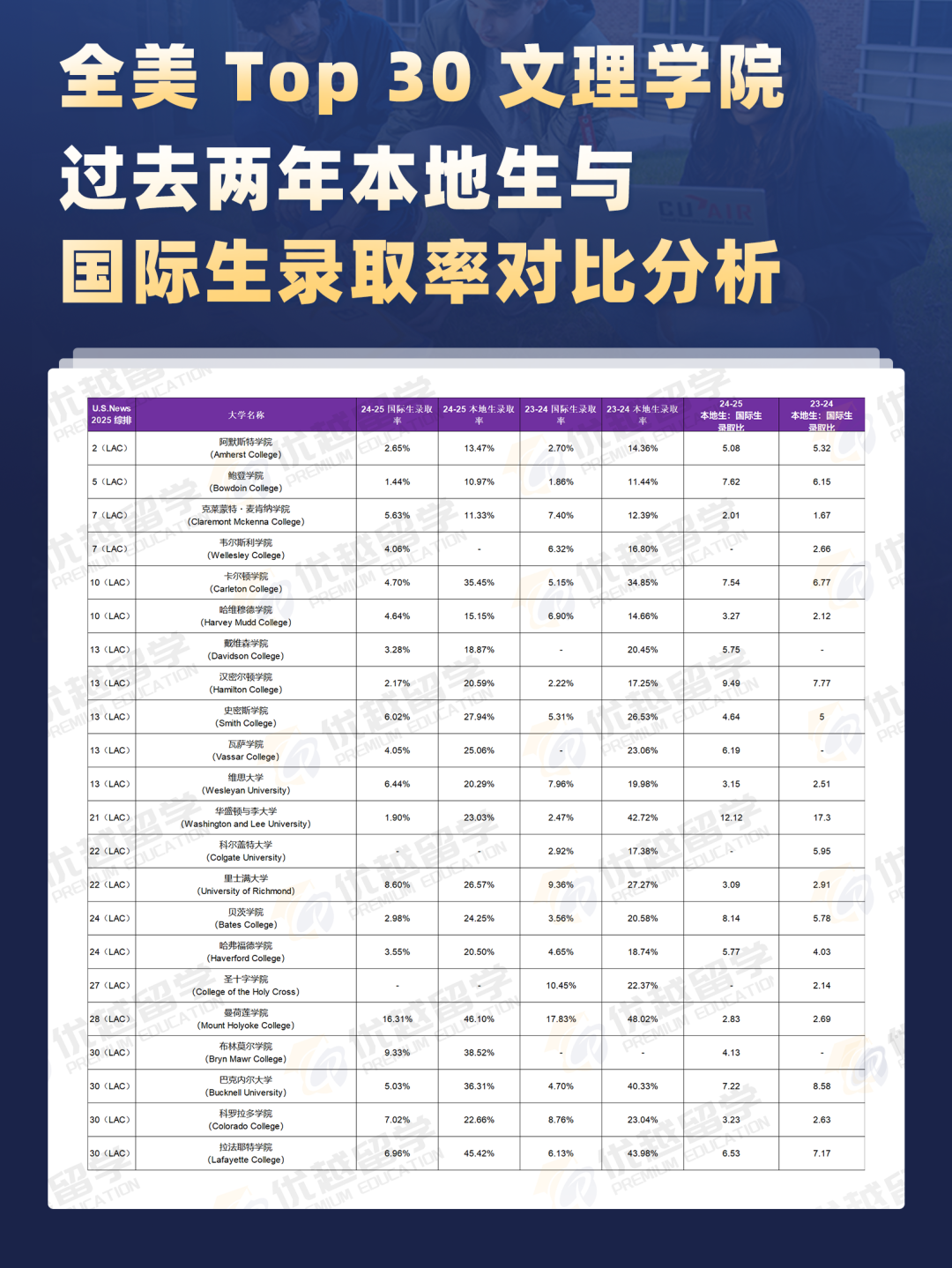 比如密尔顿学院(Top13):24-25 国际生录取率 2.17%,本地生 20.59%(差距高达 9.49 倍)。