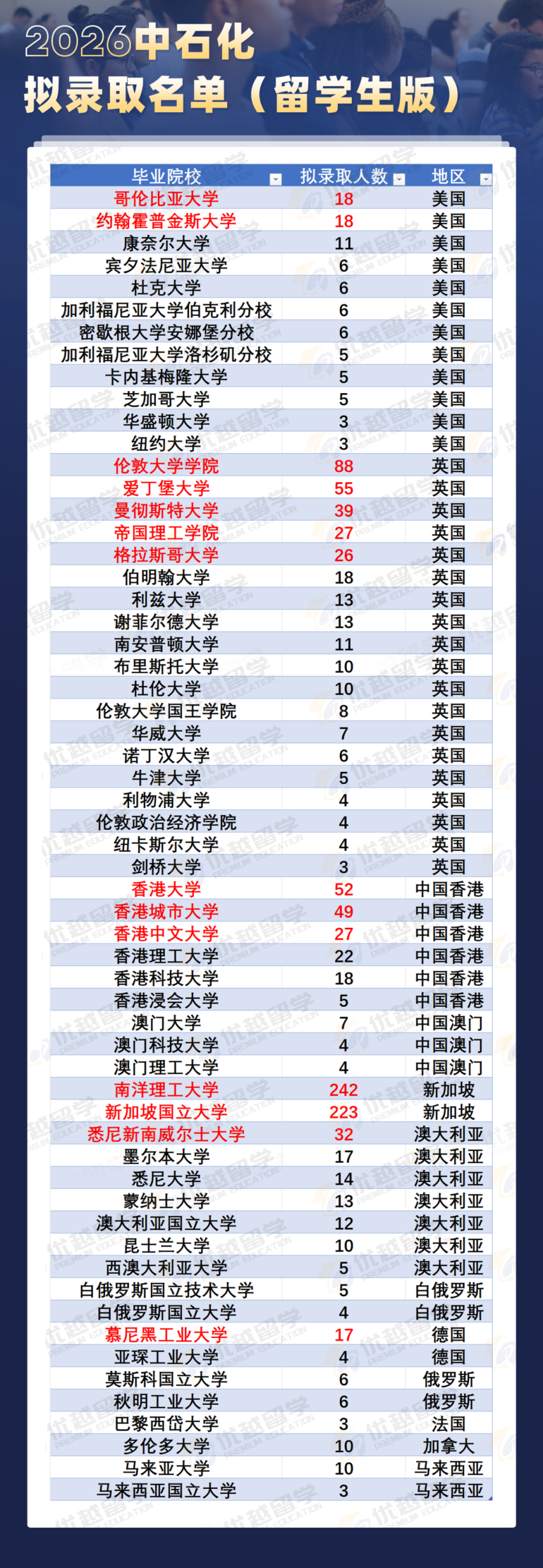 新加坡两校的录用人数几乎碾压其他地区,是中石化最青睐的海外院校之一。