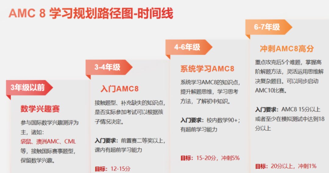 6年级:优先学习AMC8竞赛,为AMC10竞赛打基础。