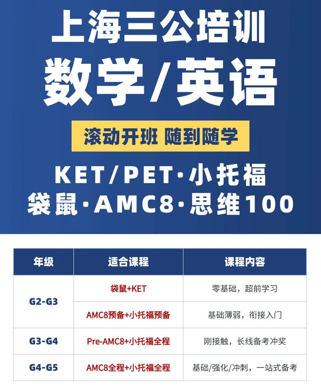 机构AMC8全程班,从基础到冲刺,分阶段培养孩子的数学思维和解题能力,帮助孩子在五年级前拿到理想分数,为三公申请增添重磅筹码。