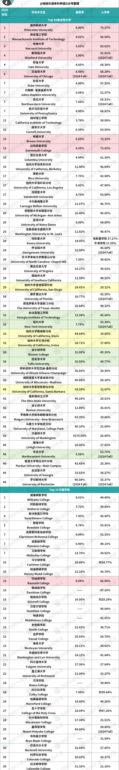为帮大家更直观了解数据,机构君整理了Top 50综合性大学和Top 30文理学院的2025 Fall学生入学率。
