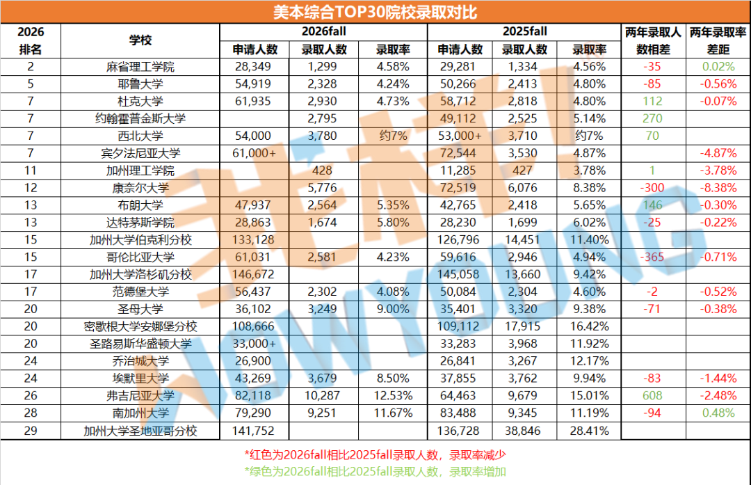 2025-26申请季已正式落幕。与去年“综合大学回暖、文理学院下跌”的态势不同,今年美本TOP30的录取格局,呈现出一幅更为复杂的图景: