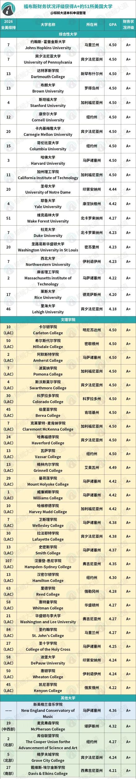 此外,《福布斯》每年会发布美国大学财务状况评级,机构君做了最新统计。全美共51所大学获得A+,包括耶鲁、JHU、宾大、达特茅斯、布朗、斯坦福、康奈尔等,财务状况十分稳健。