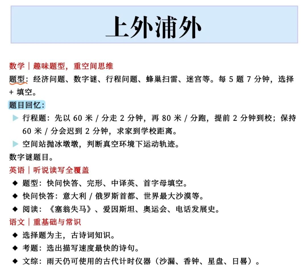 中队长 / 大队委、小托福高分、AMC8 19‑20 分、各类数学竞赛奖、特长证书、校内荣誉等,几乎是标配。