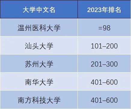 中国大陆共有7所高校进入总排名,分别是上海大学、南方科技大学、汕头大学、苏州大学、广东工业大学、南华大学和北京工商大学。其中,4所进入了世界前600名。