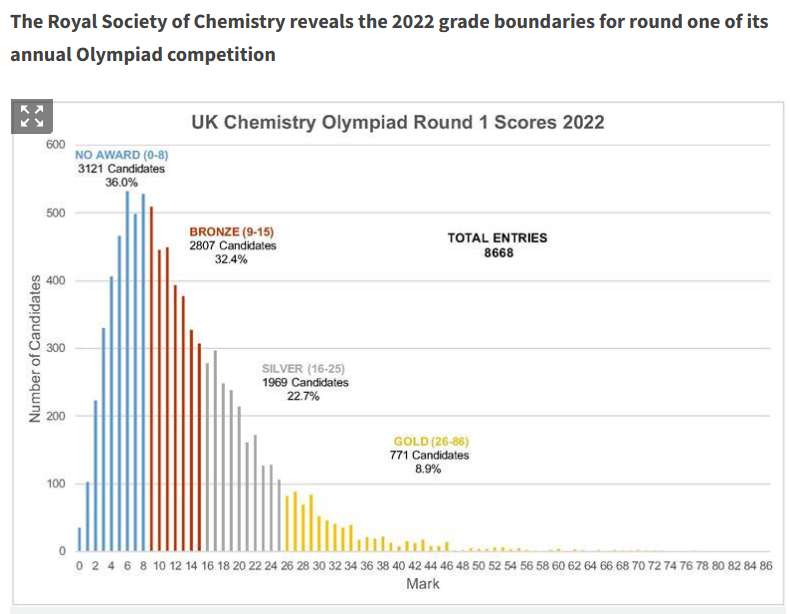 我们再来看看2022年UKChO的获奖分数线,根据官方2022的考试报告可以看出,该报告统计共有8668名学生参加了考试,在2022年学生分数达到26+分能获得金奖,16-25分获得银奖,9-15分获得铜奖,可见这一年的考试难度还是非常大的。 由此可见,网友感慨的43分“低分”无论是在2022年还是2023年,都是妥妥的金奖!