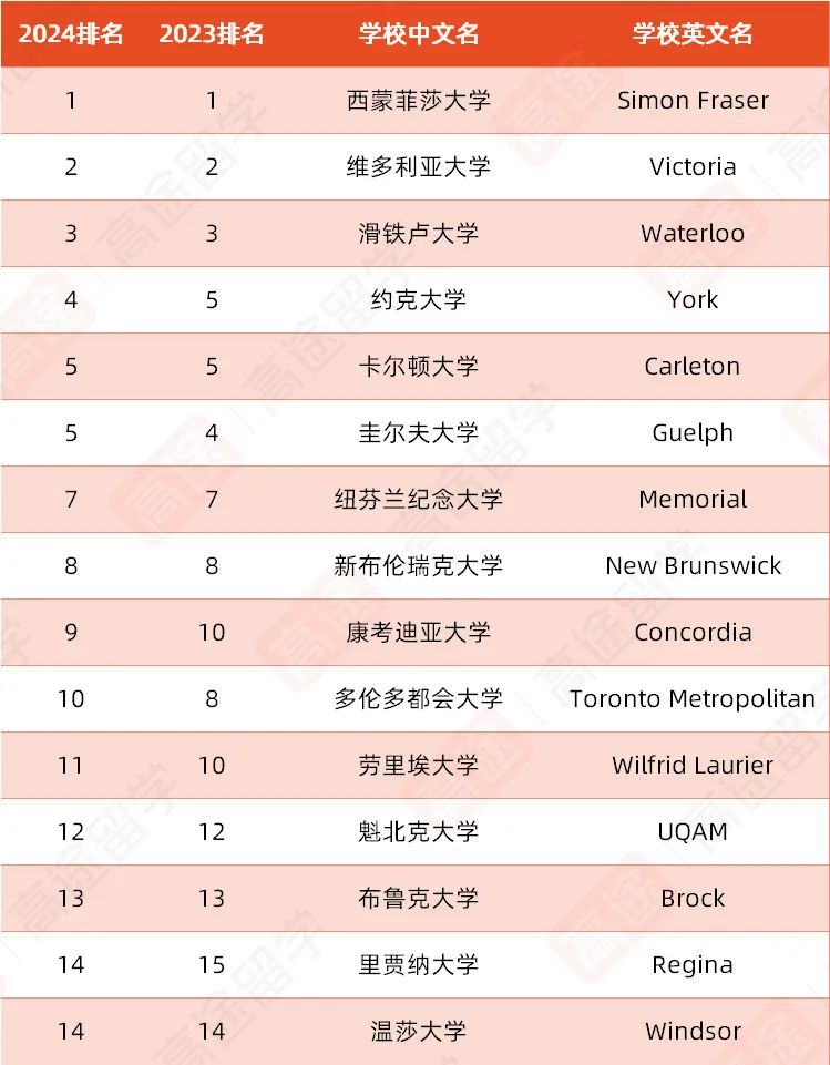渥太华大学(第5名)和阿尔伯塔大学(第6名)互换名次,分别上升、下降1名;卡尔加里大学(第7名)上升2名。