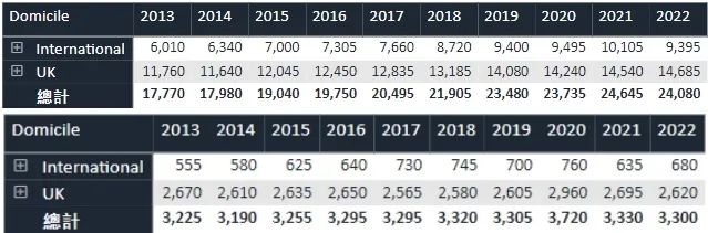 牛津本科申请人数逐年上涨,而课位变化不大,申录数据从十年前的18%一路降到最近两年的13%左右,可见其火爆程度。2022年以13.8%比上一年的13.5%略有回升。