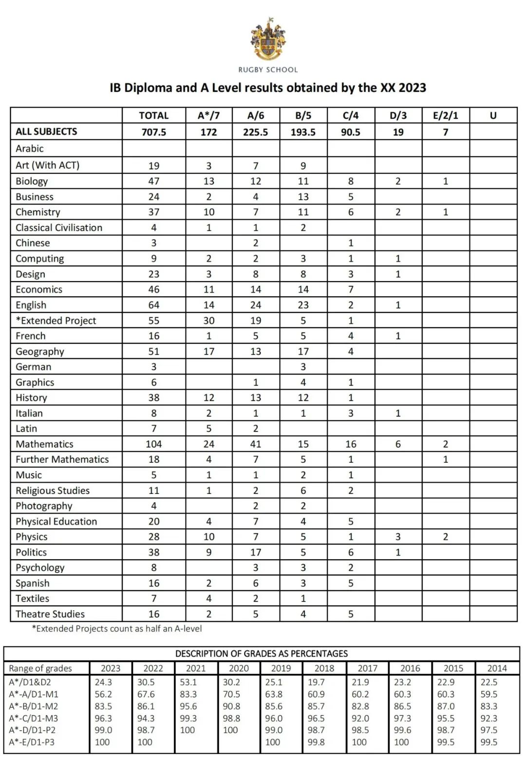 ☛ 拉格比公学2023年A-Level/IB成绩单: