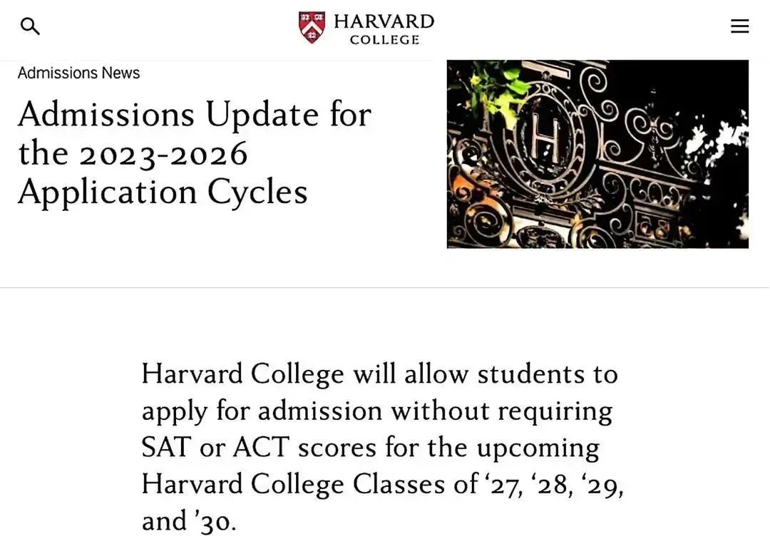 2、哈佛大学:2023-2026秋季入学申请都是标化可选政策
