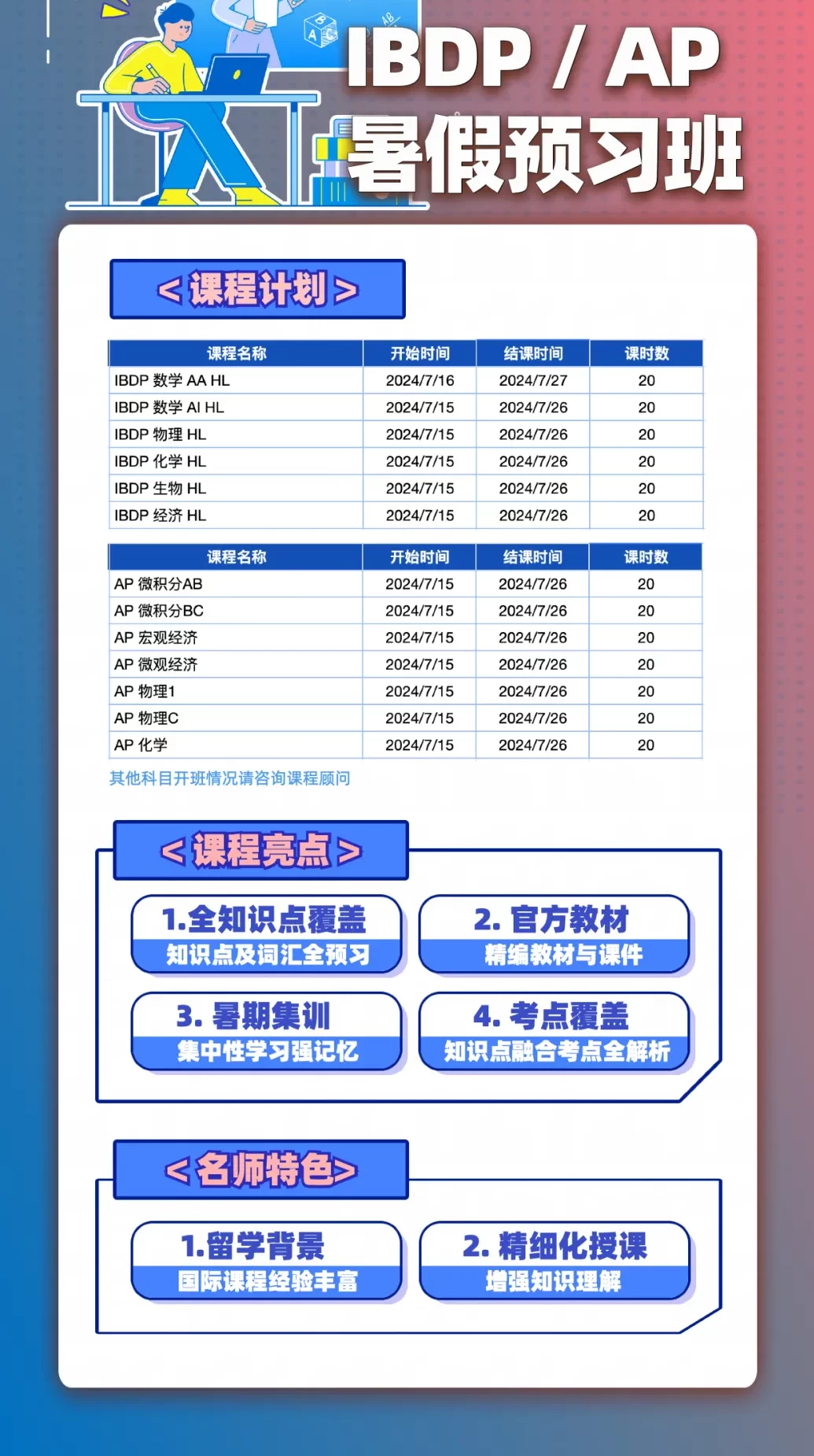 机构IGCSE/ALevel/IBDP/AP国际课程暑假班上线,课程分为先行班、同步培优班、考前冲刺等多种班型,线上/线下同步开课,学生可自由选择上课模式,支持自组班学习。